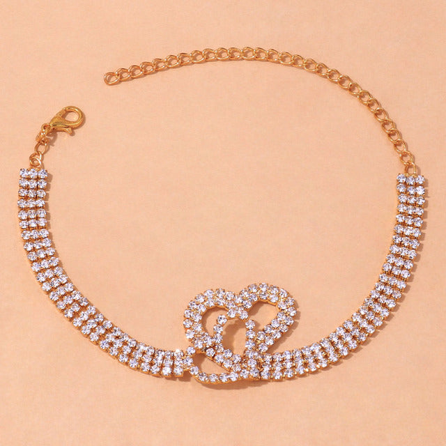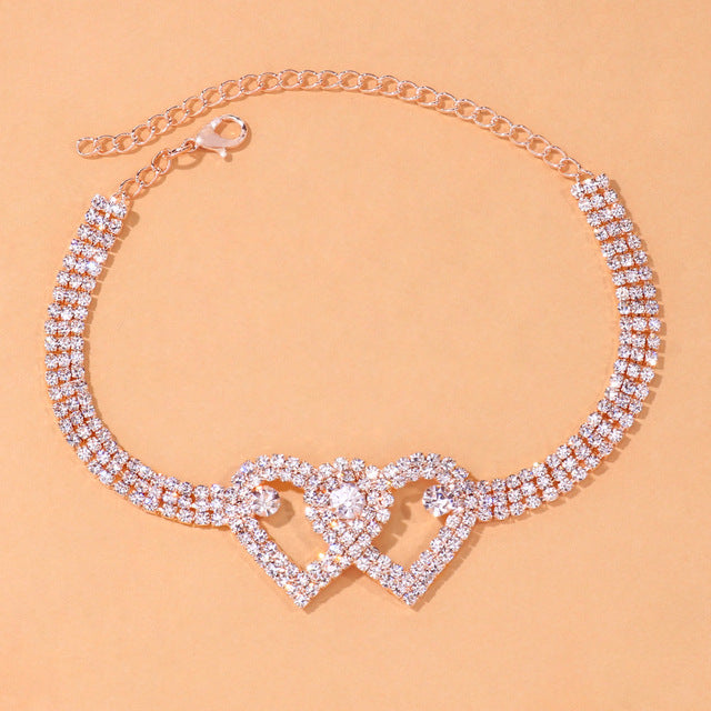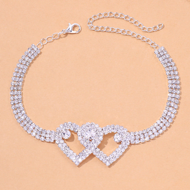 1*Rhinestone Double Heart Anklet for Women Hollow Out Love Foot Anklet