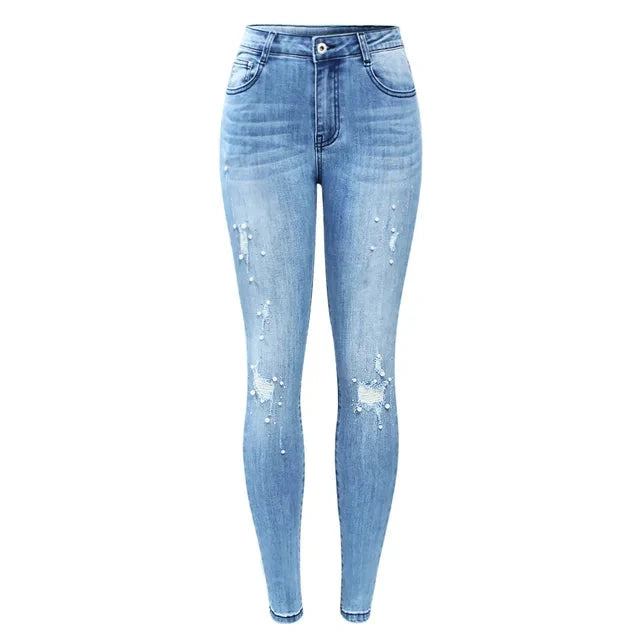1*Ripped Jeans With Beads Woman Stretchy Denim Skinny Pants Trousers