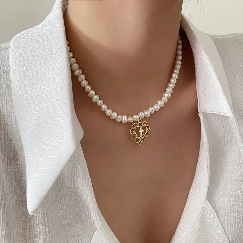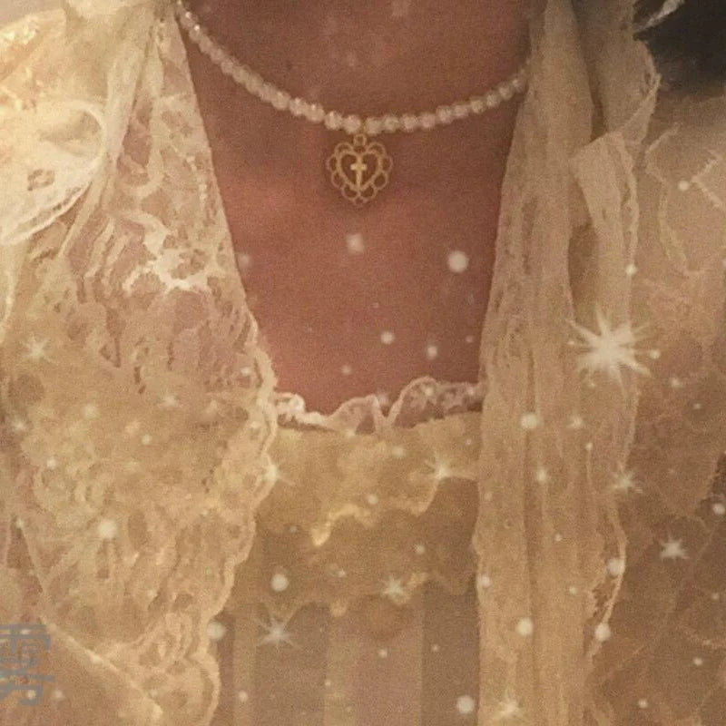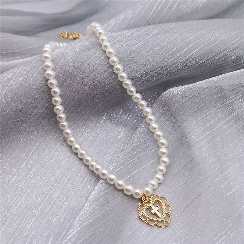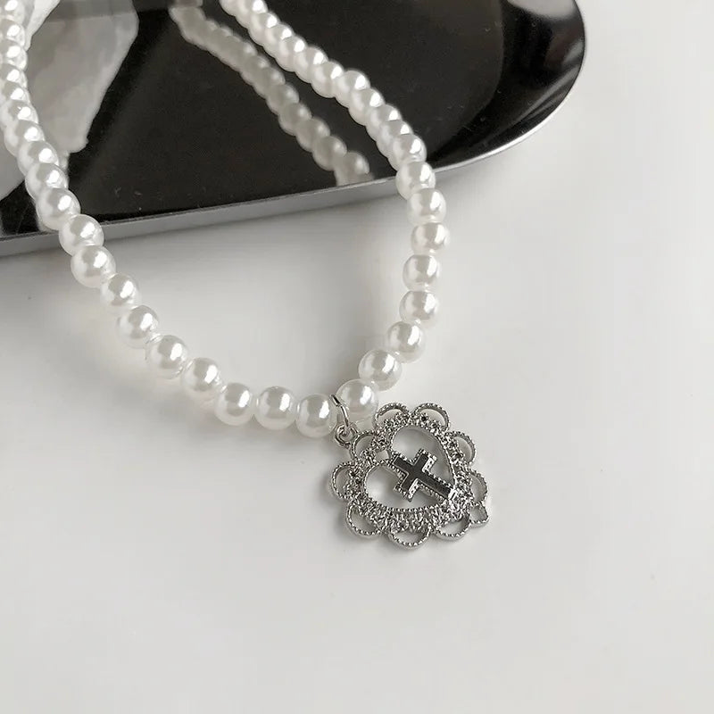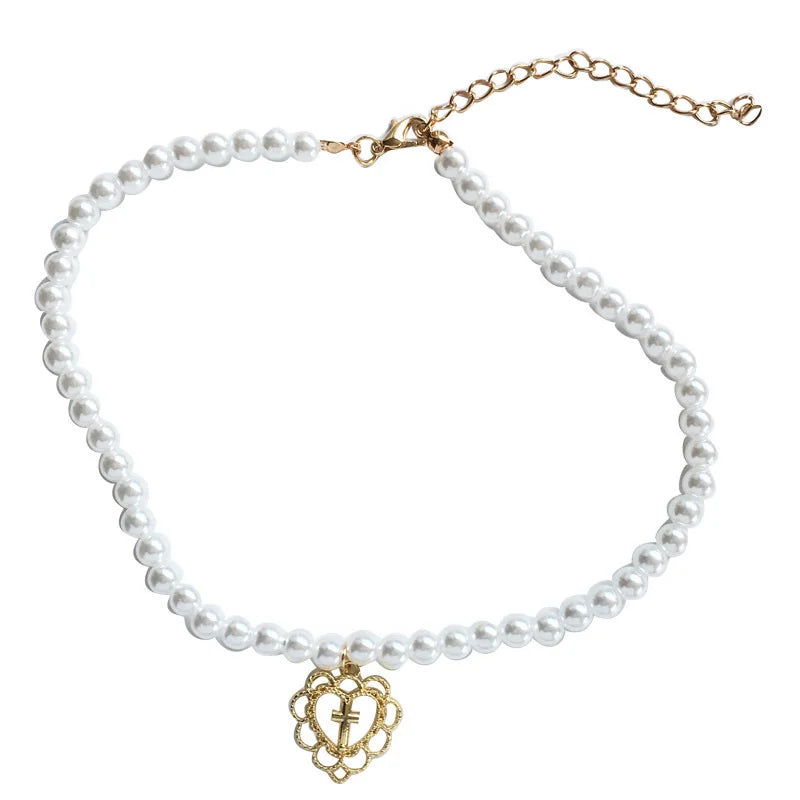 Retro Palace Hollow Love Cross Pearl Choker Necklace Clavicle Chain