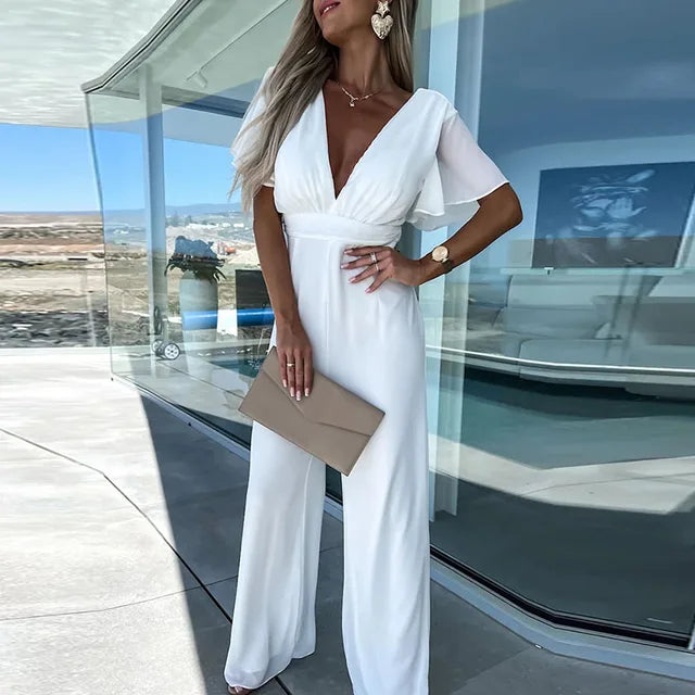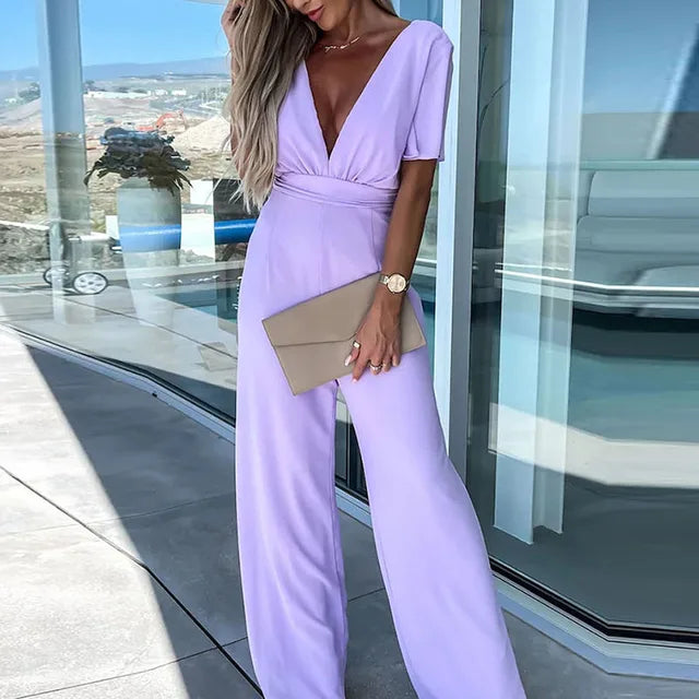 Elegant High Waist Romper V Neck Solid Color Wide Leg Pants Jumpsuit