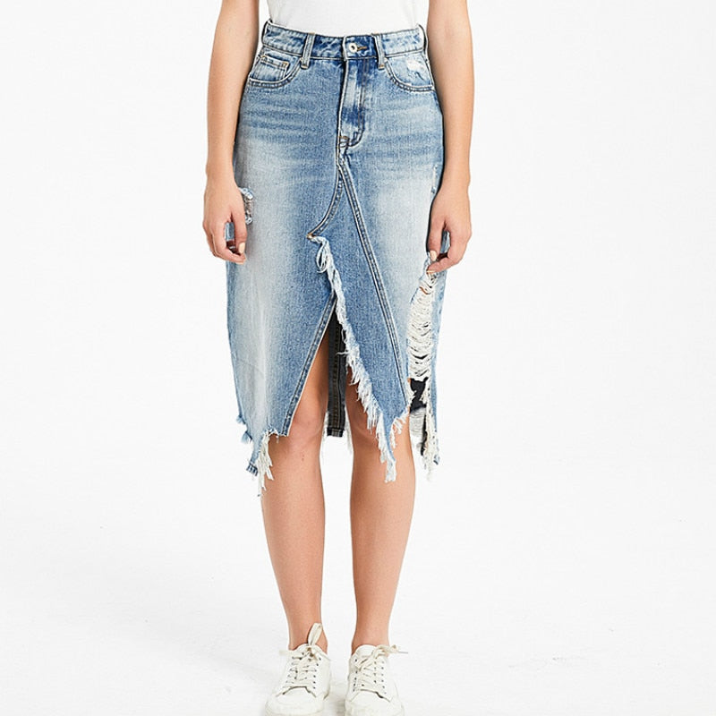 Ripped Denim Women Asymmetrical Pencil Jean Skirt High Split Skirt