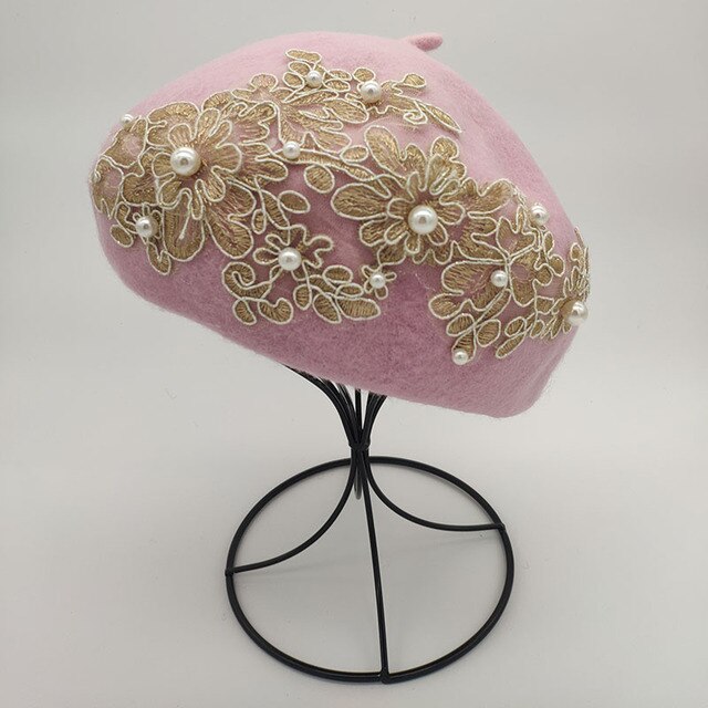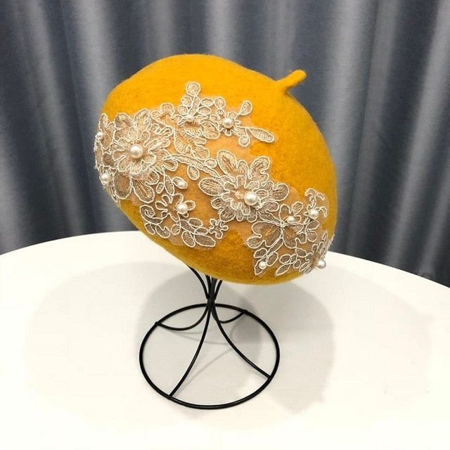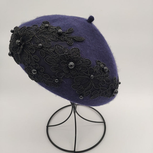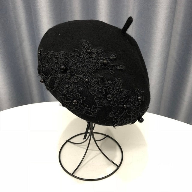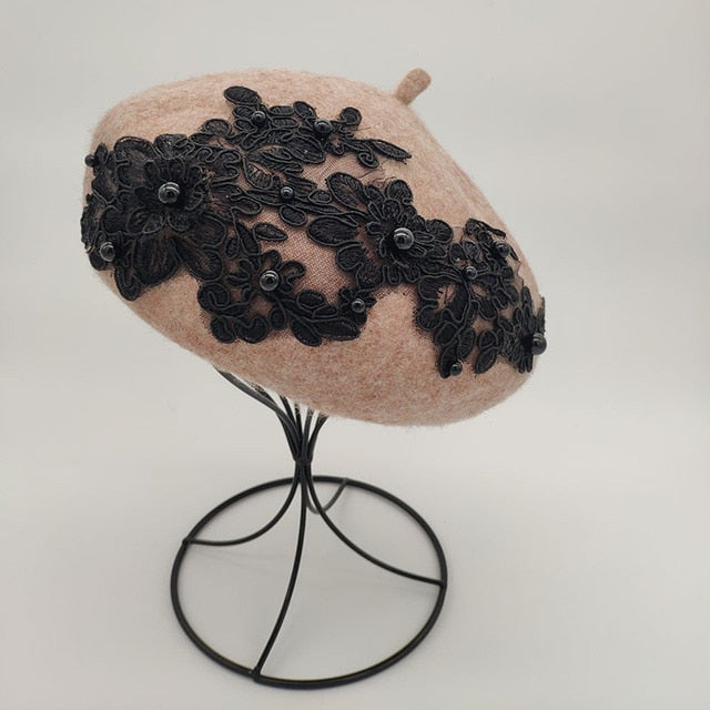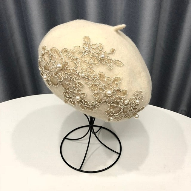 Winter Wool Beret With Lace And Pearls Female Wool Cap