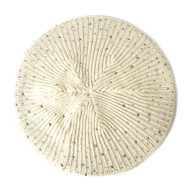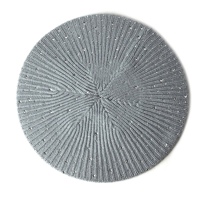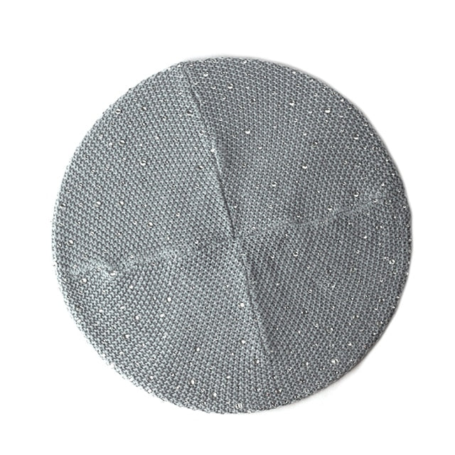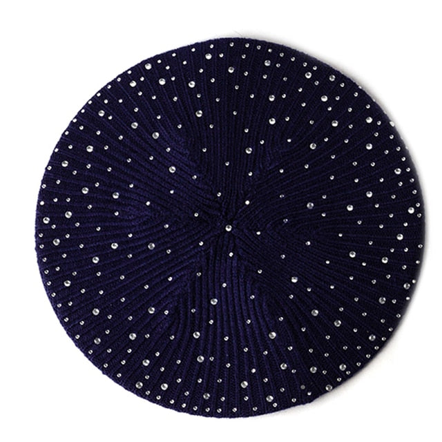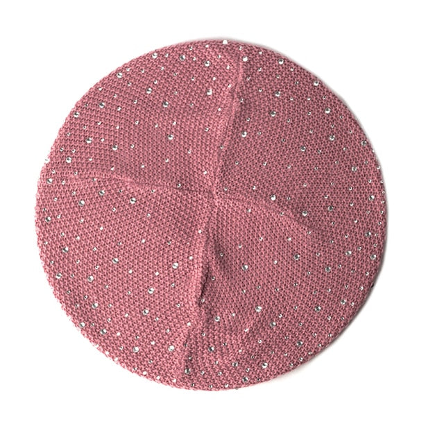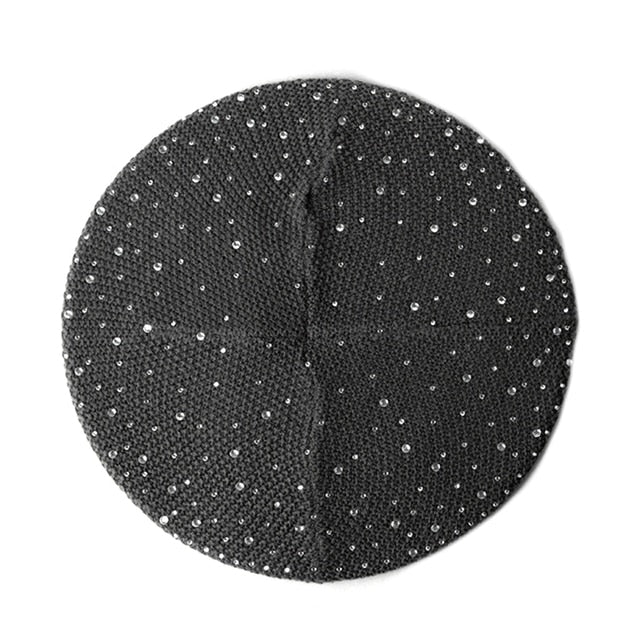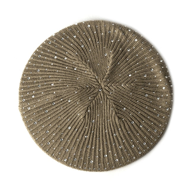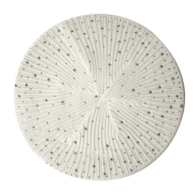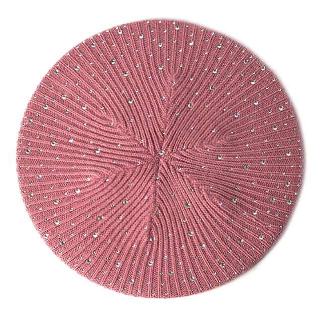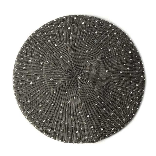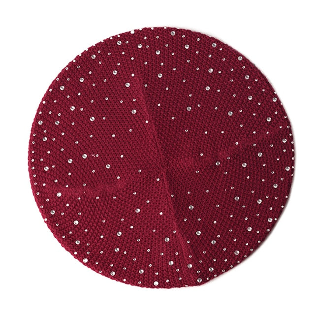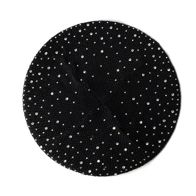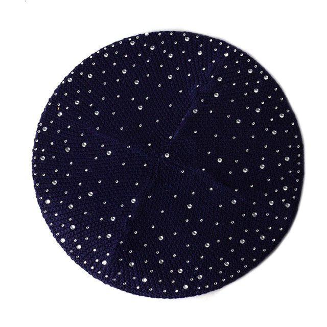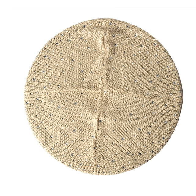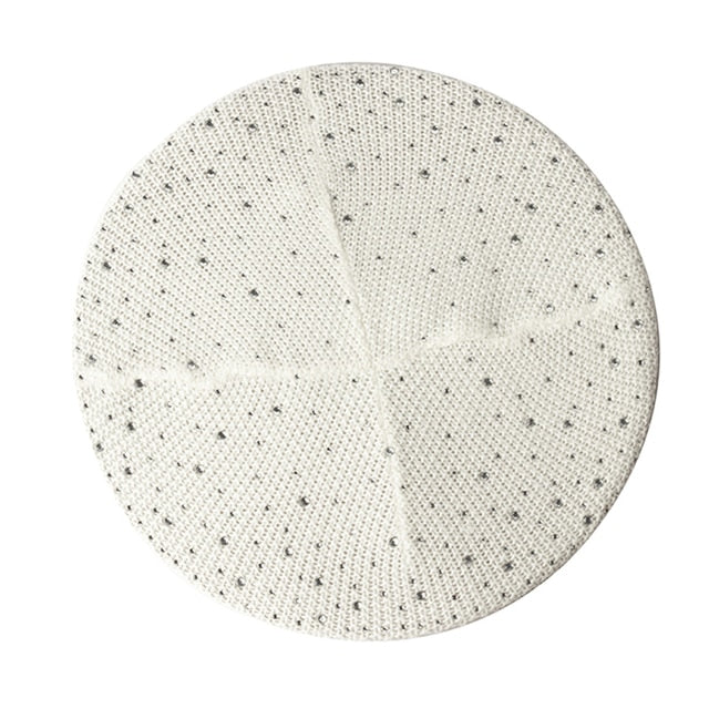 Women Autumn Winter Beret Hat Female Knitted Casual Rhinestone Cap