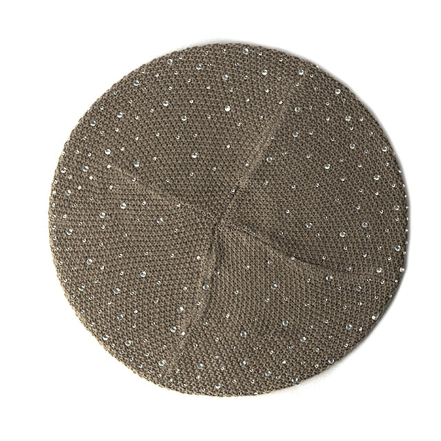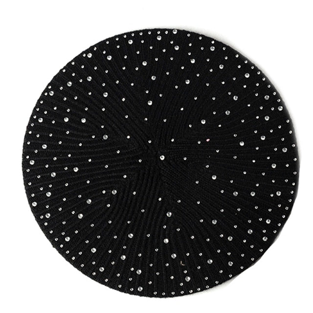 1*Women Autumn Winter Beret Hat Female Knitted Casual Rhinestone Cap