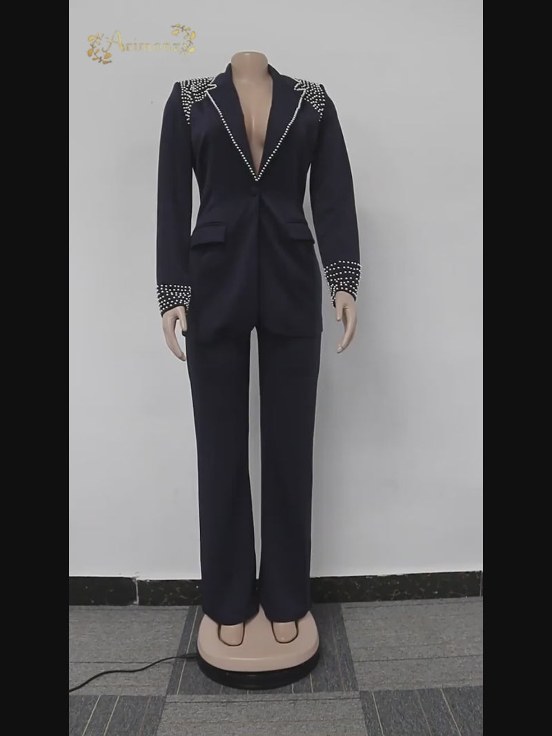 1 * Elegant Pearl Blazer Coat and Straight Pants Matching Set for Women