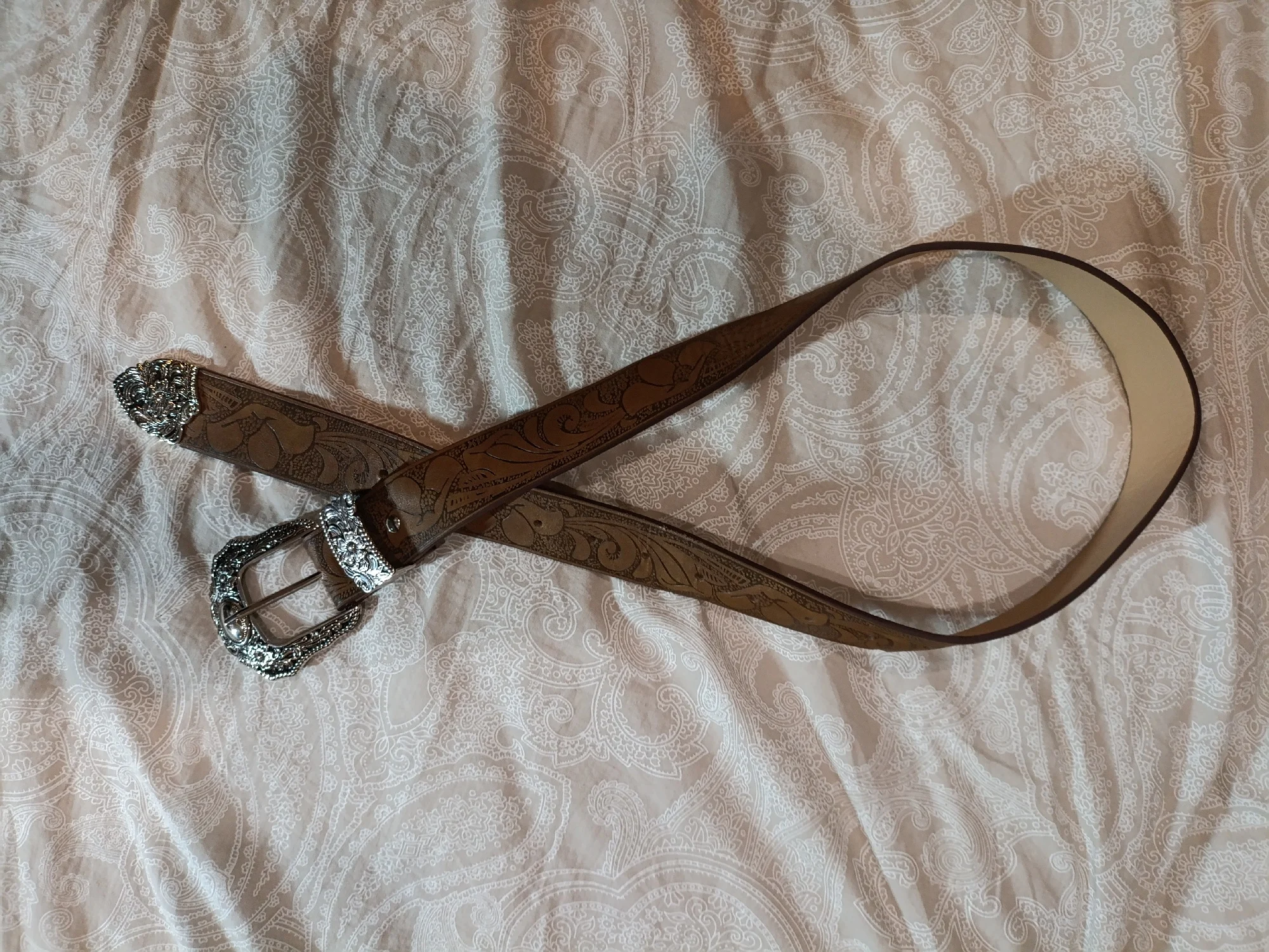 The belt is awesome!!! Exactly as in the photo and description. The width is approximately 3.8, but due to the metal tip, it doesn't fit all jeans - please keep this in mind.
