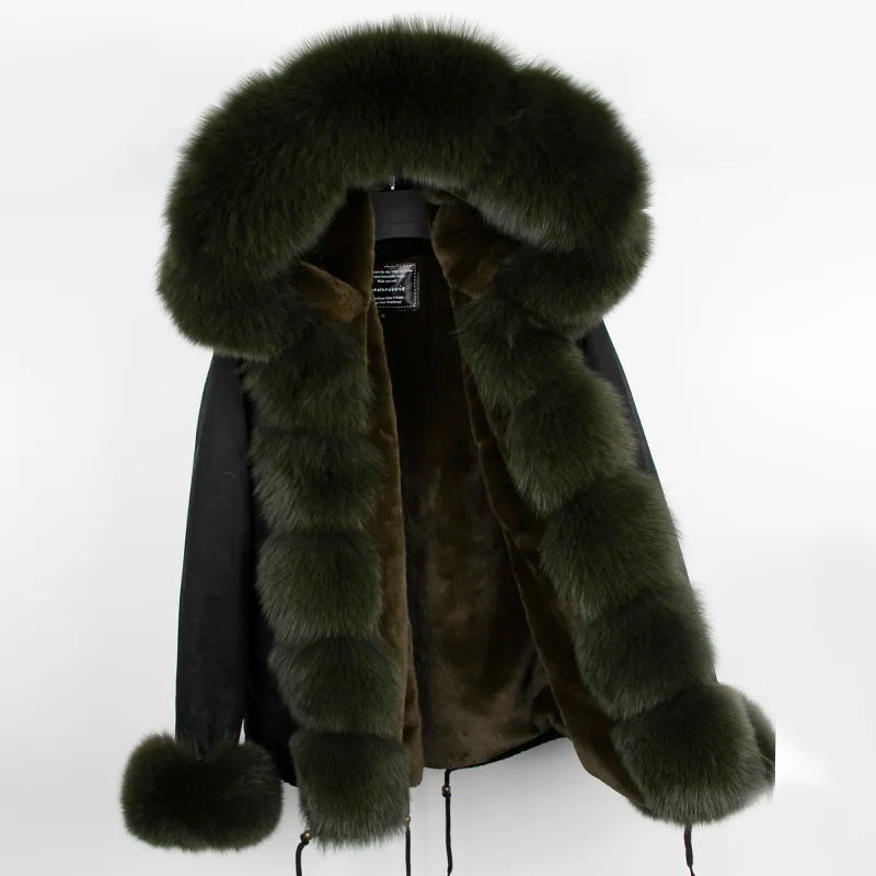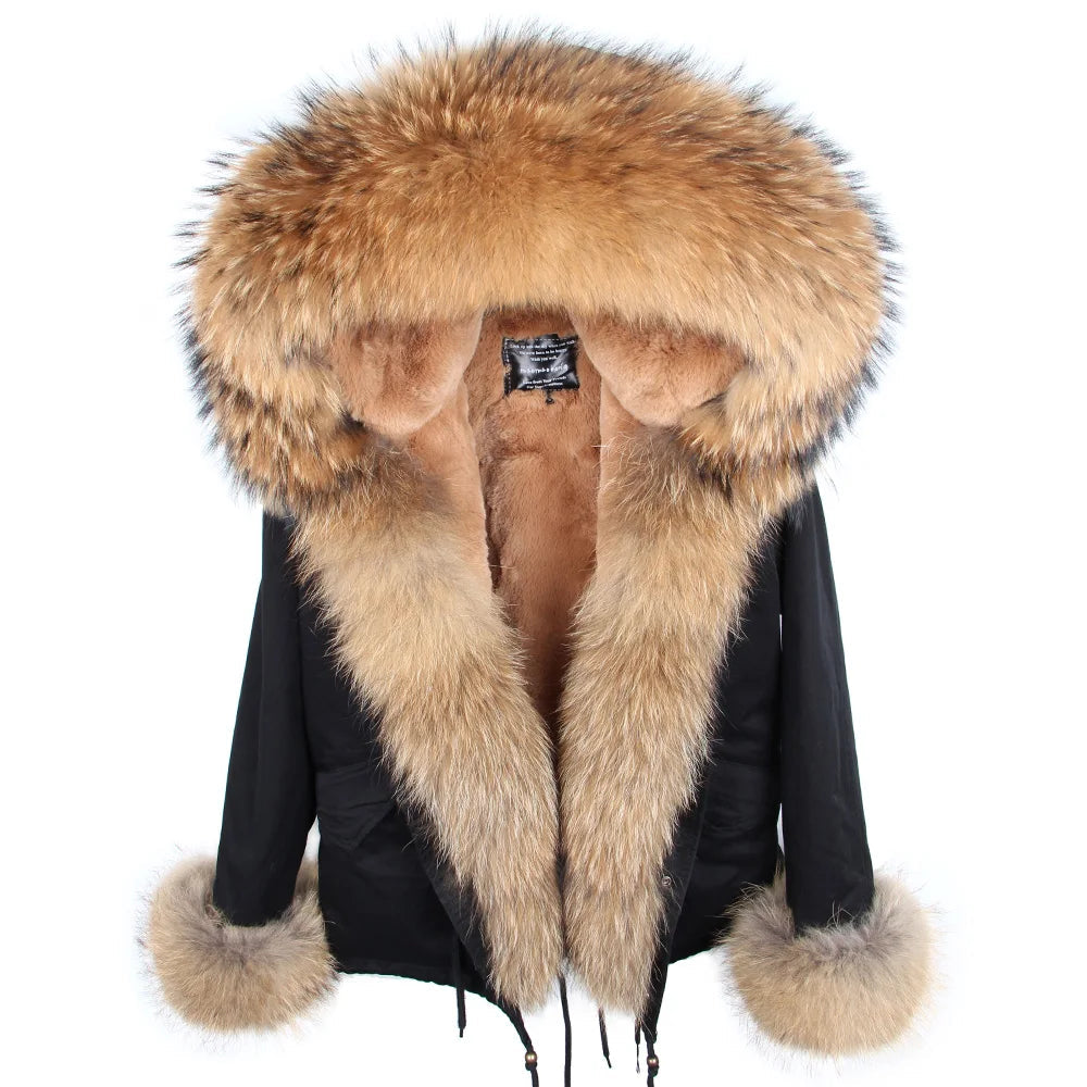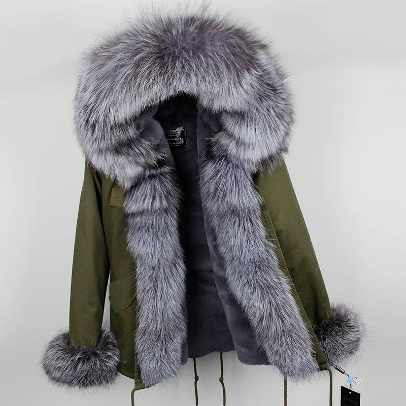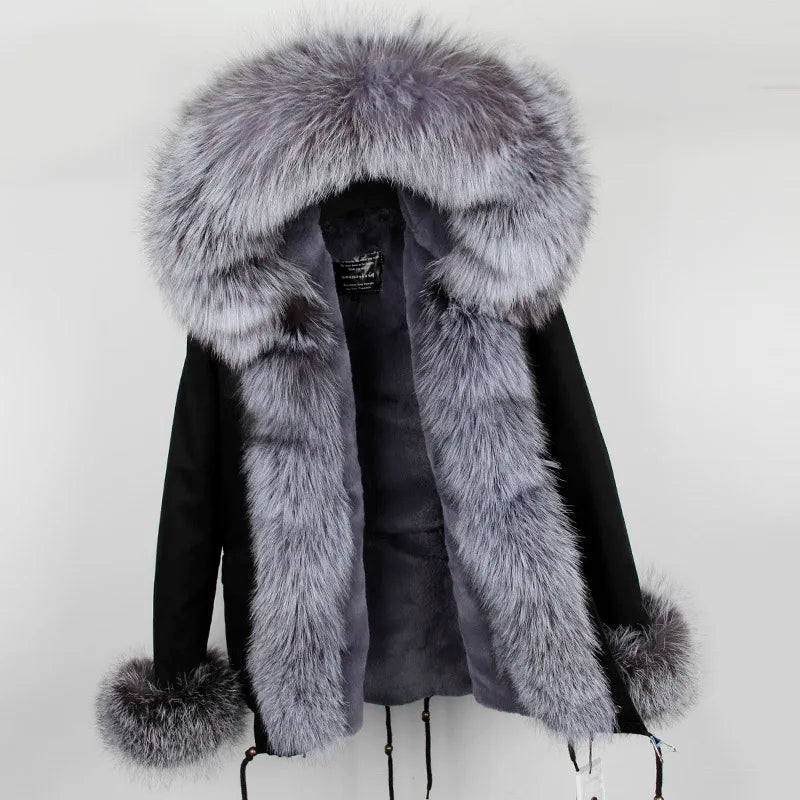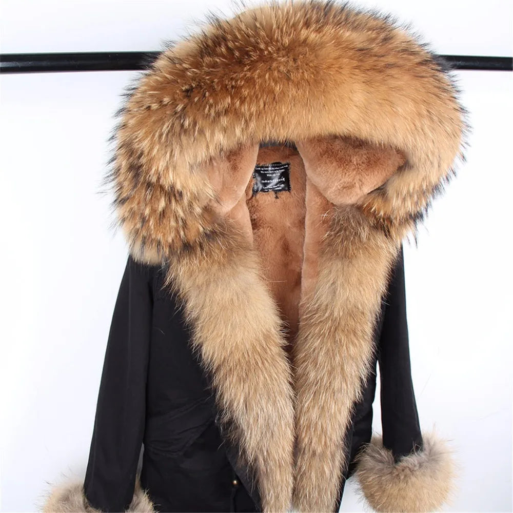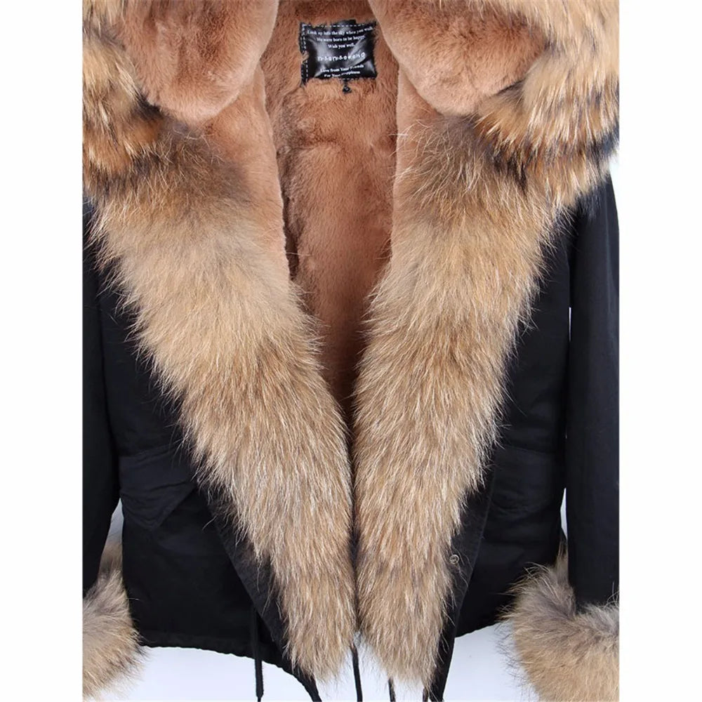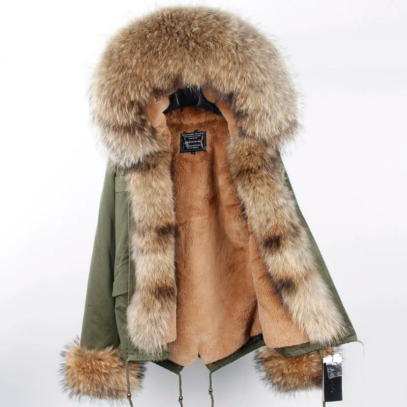 Real Fox Raccoon Fur Collar Winter Parka Jacket with Inner Fur Lining