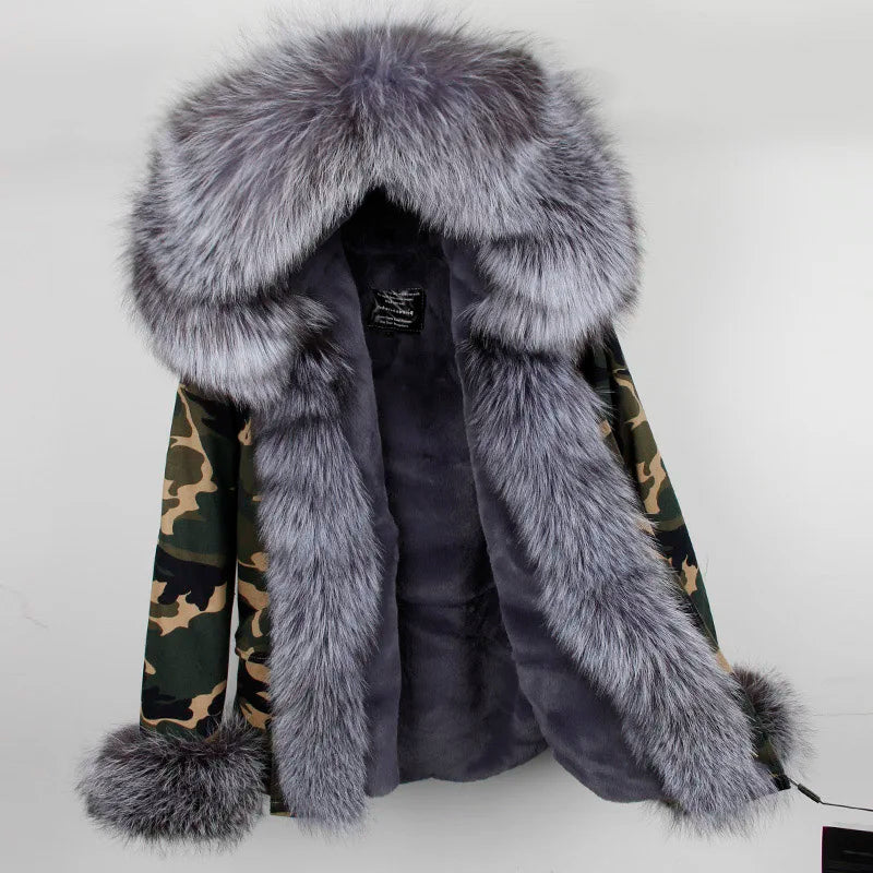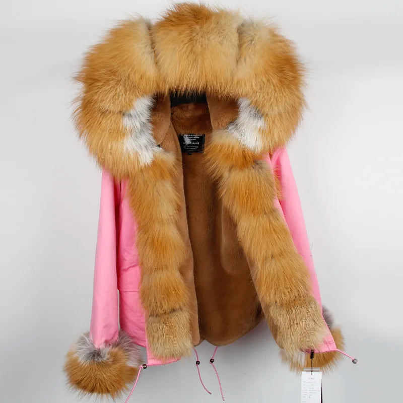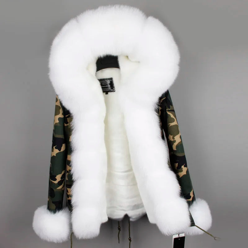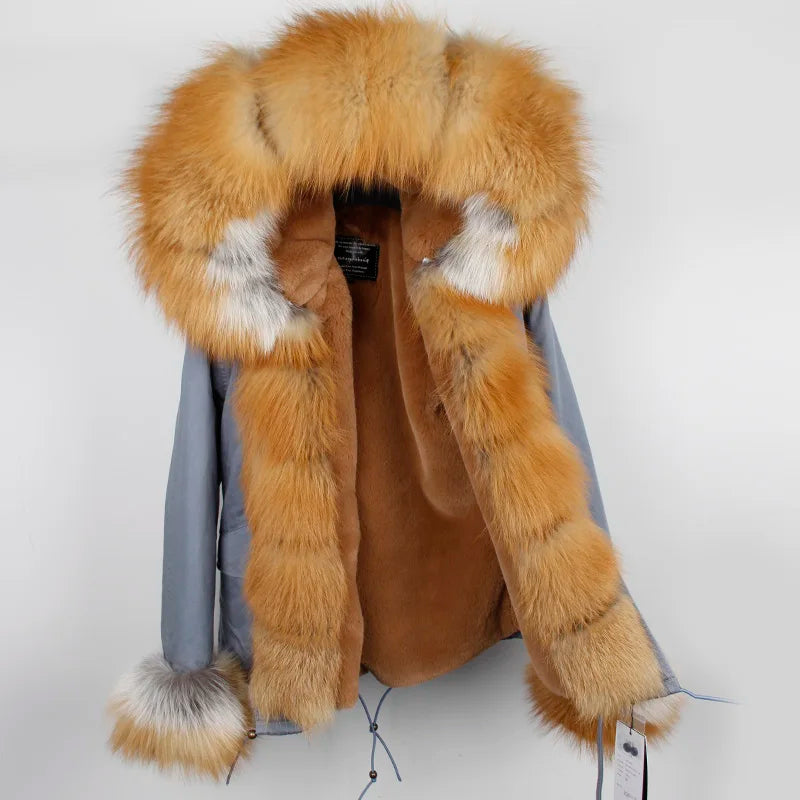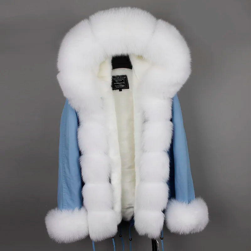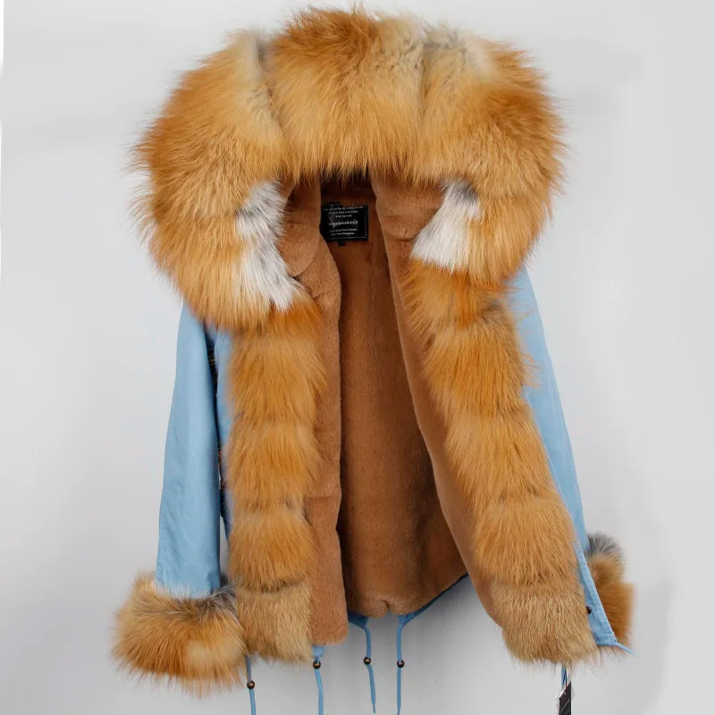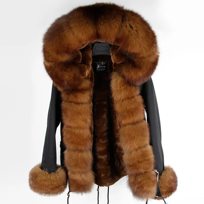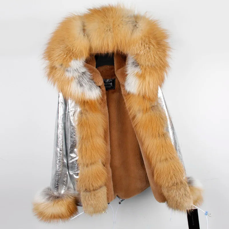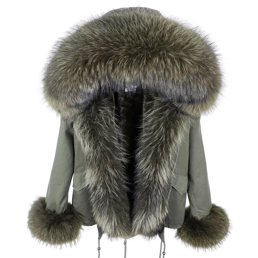 Real Fox Raccoon Fur Collar Winter Parka Jacket with Inner Fur Lining