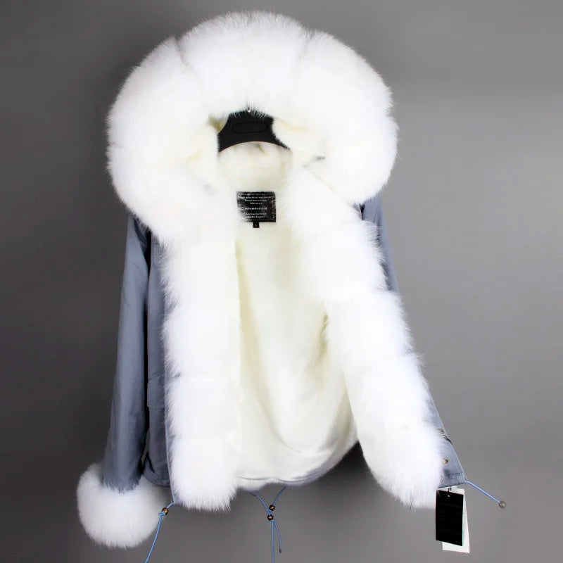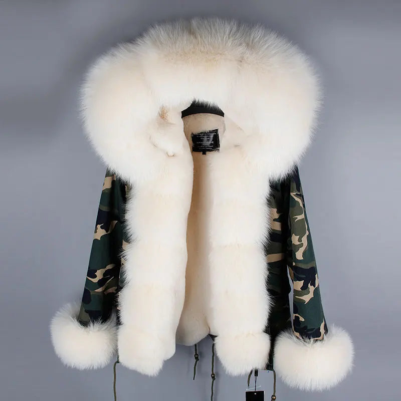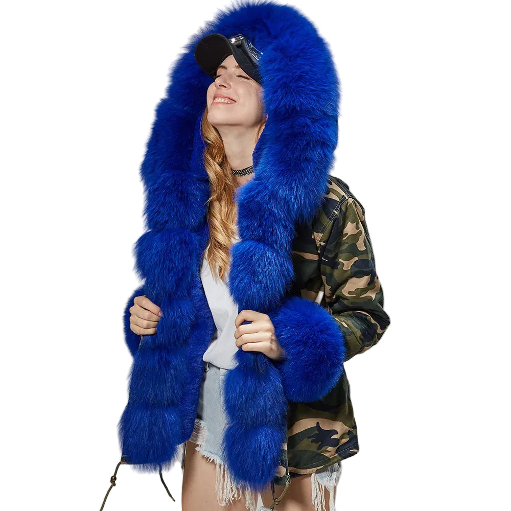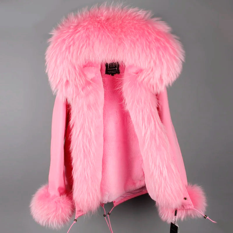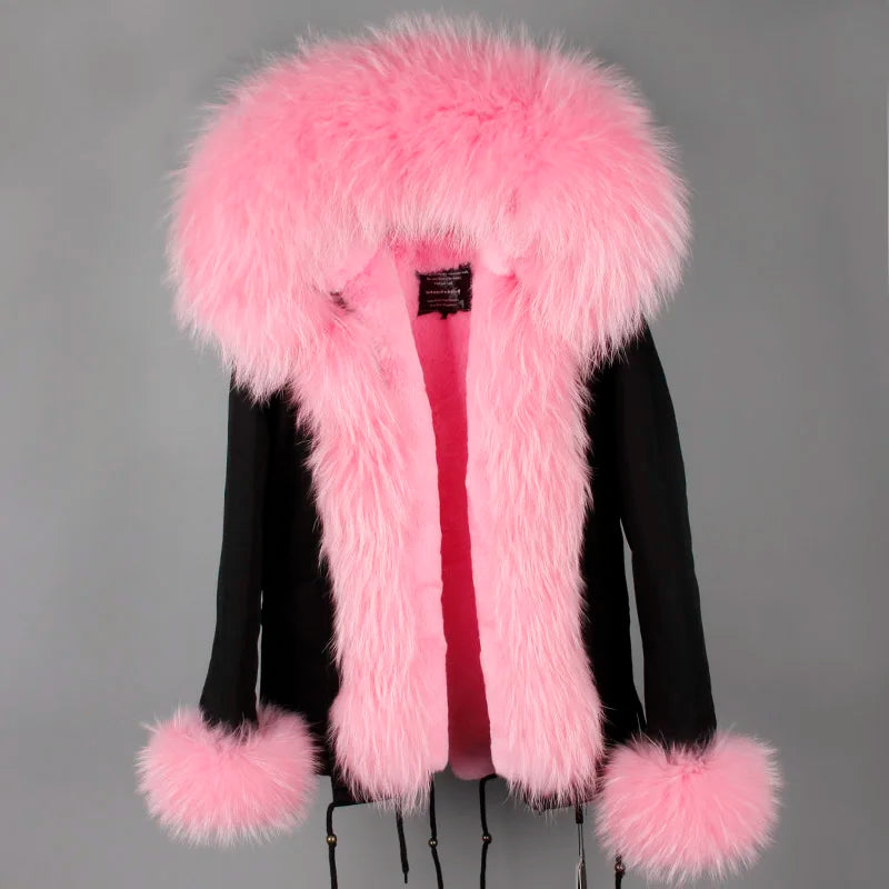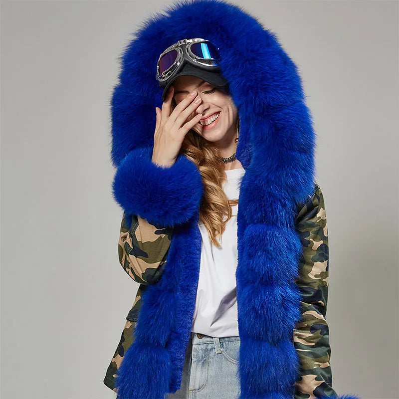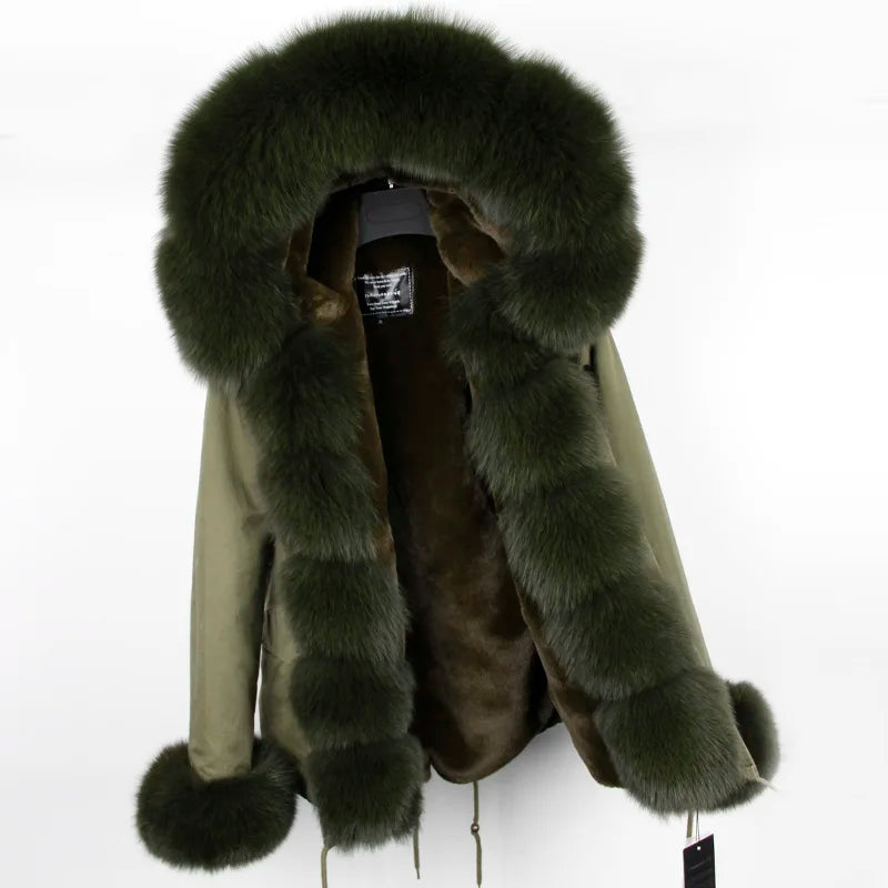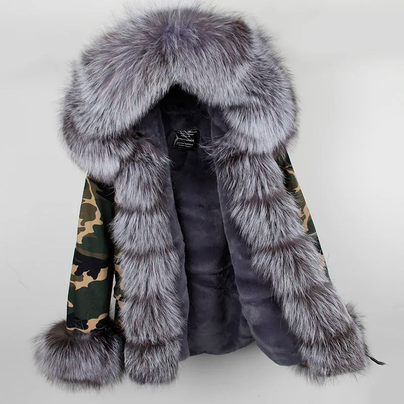 Real Fox Raccoon Fur Collar Winter Parka Jacket with Inner Fur Lining