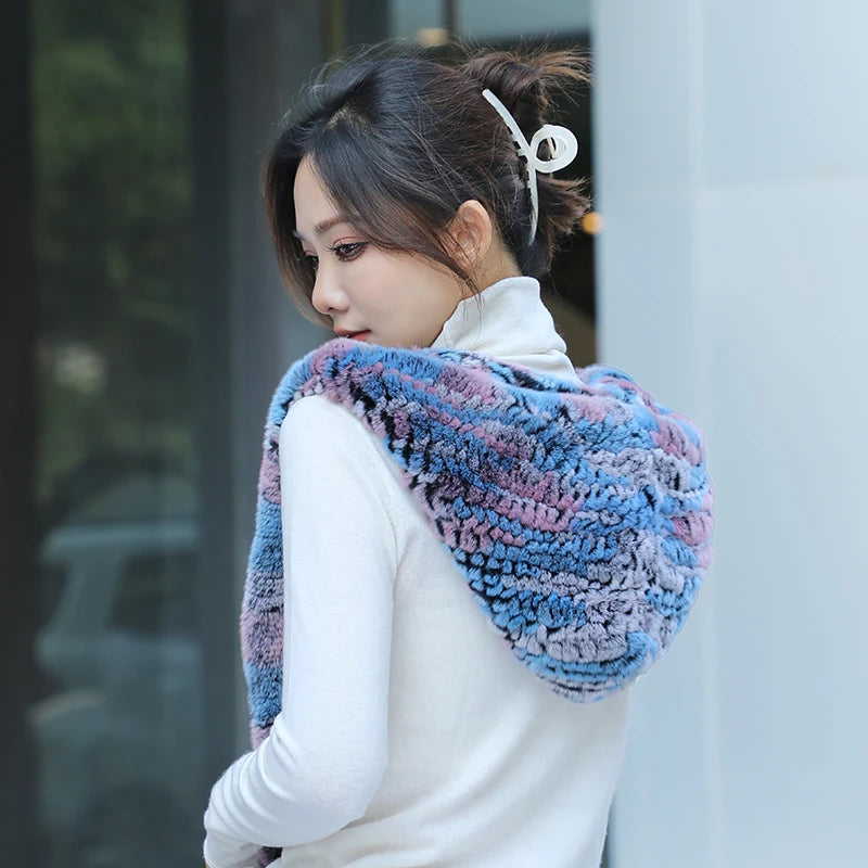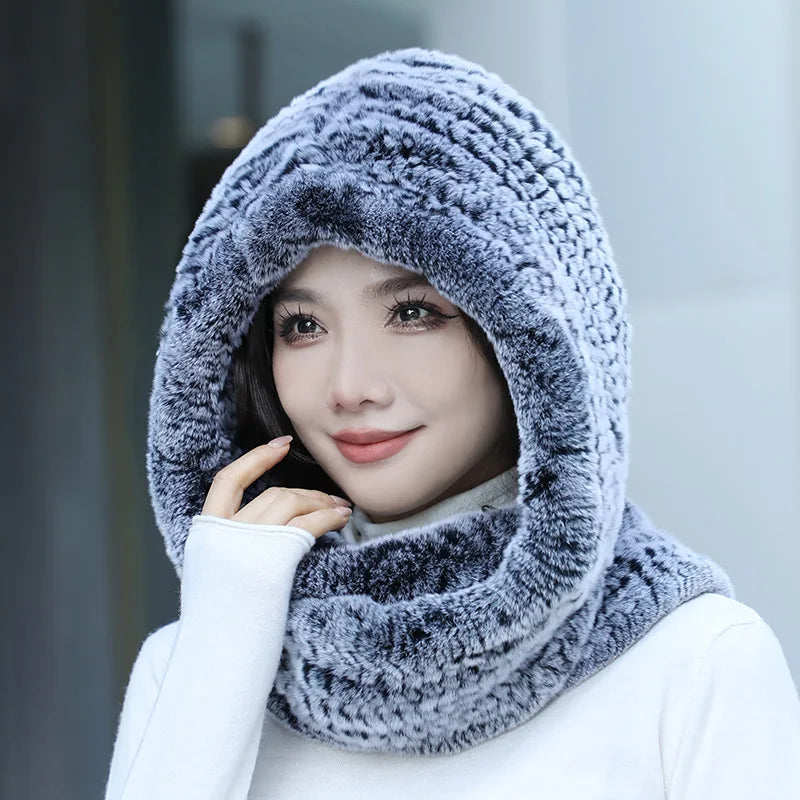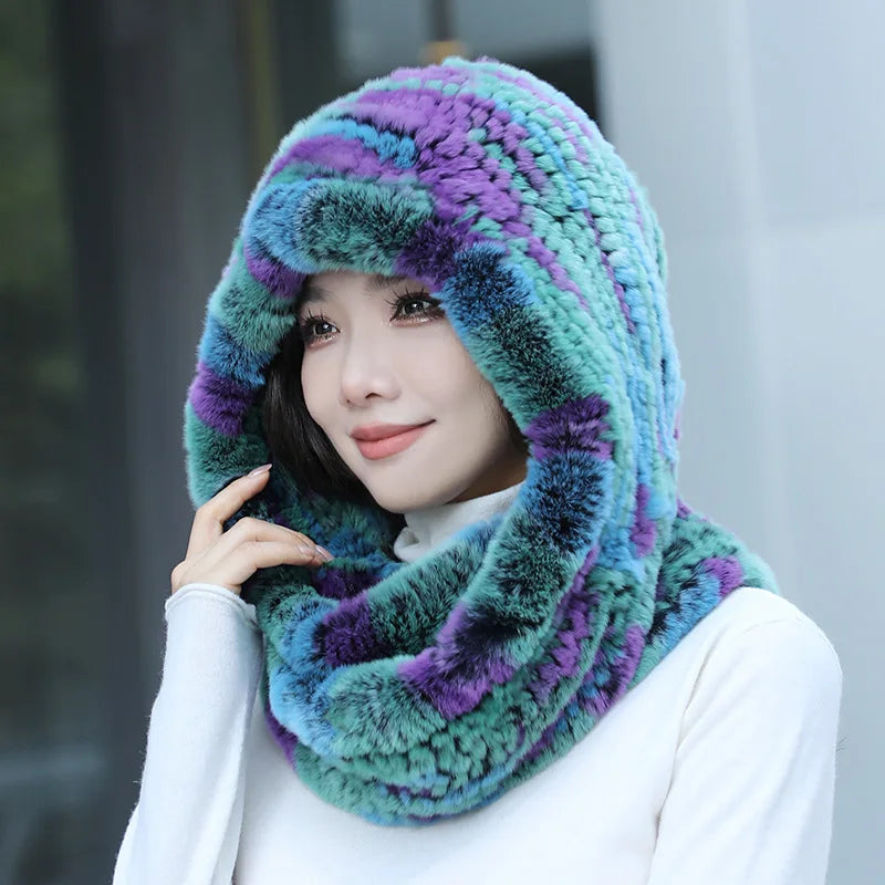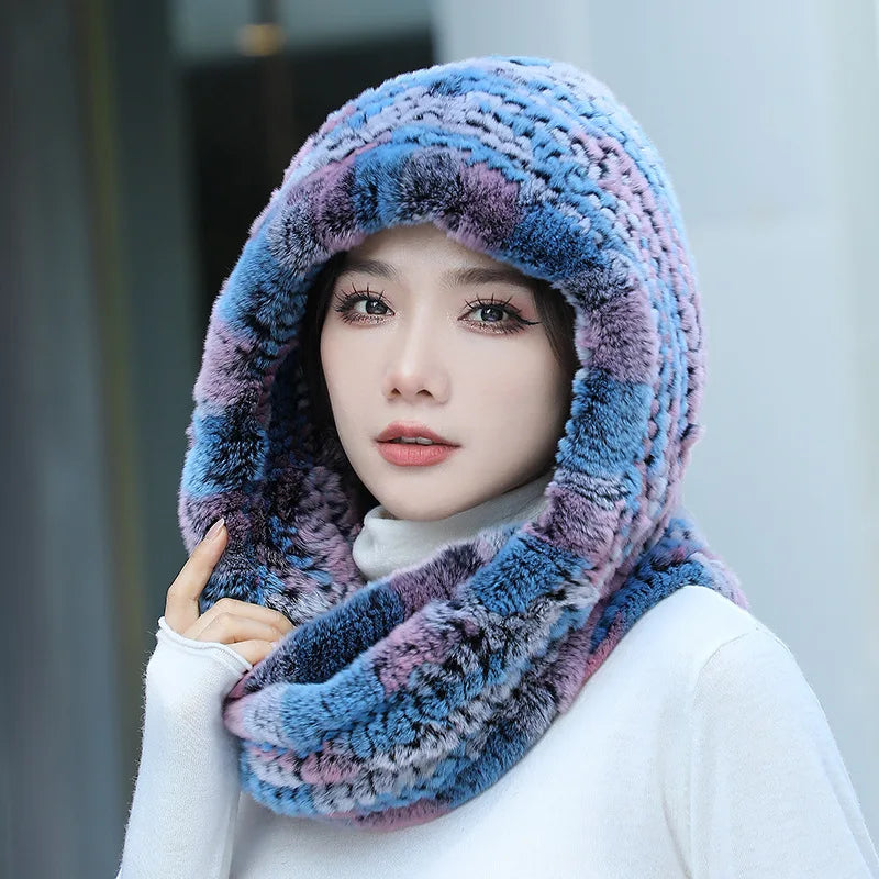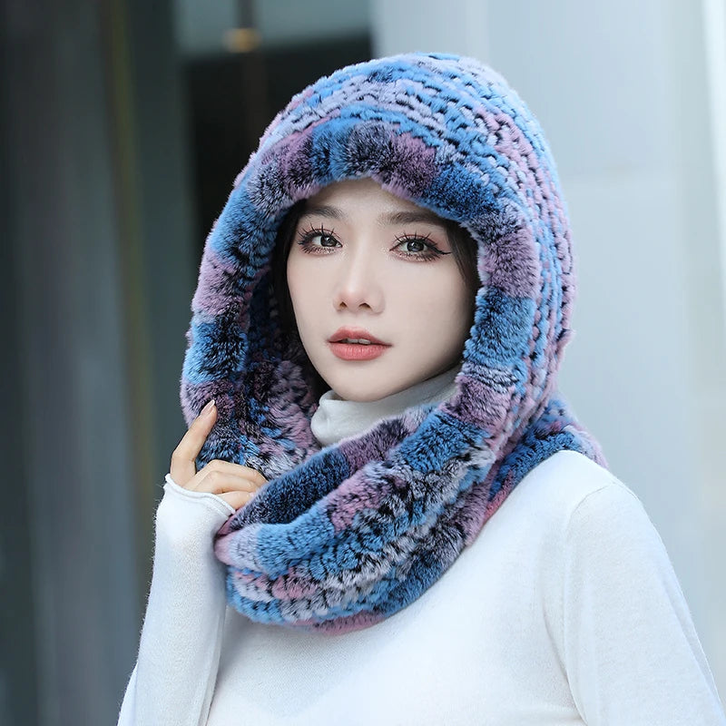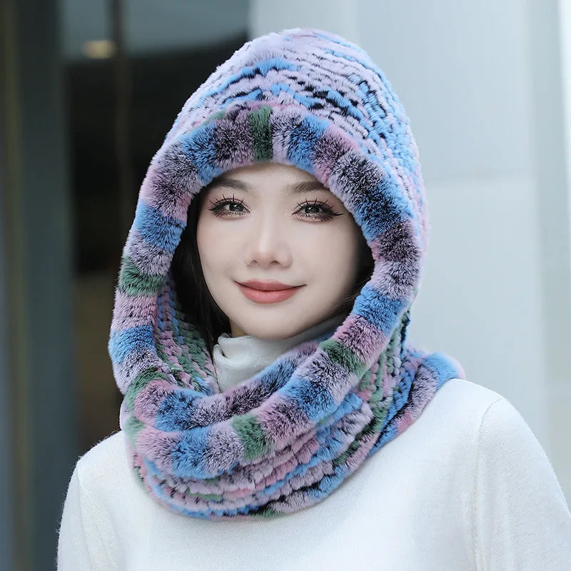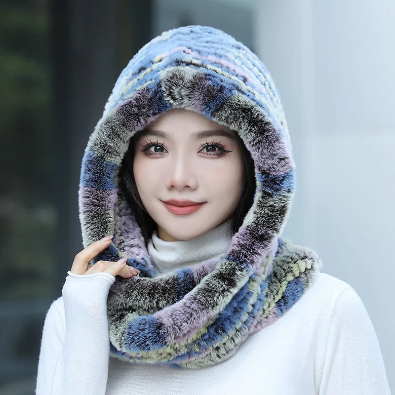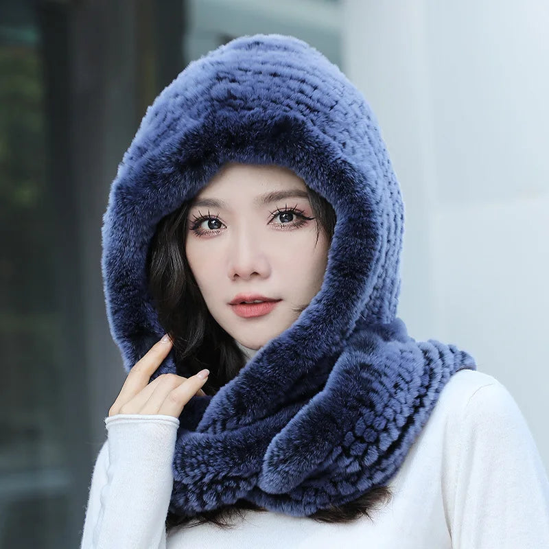 Real Knitted Rex Rabbit Fur Hat Hooded Scarf Neck Collar Hat with Scarf