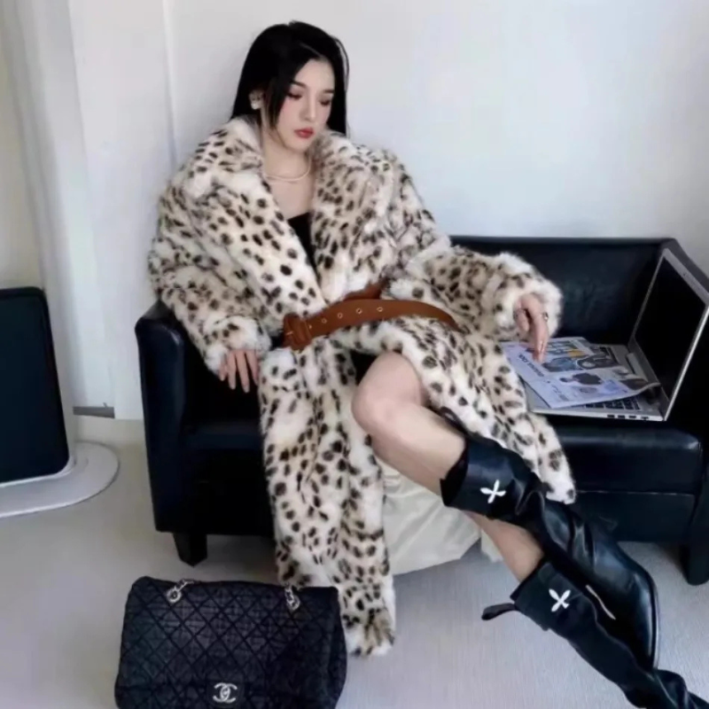 Elegant Faux Mink Fur Coat Leopard Print Winter Jacket with Flip Collar
