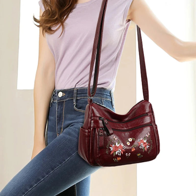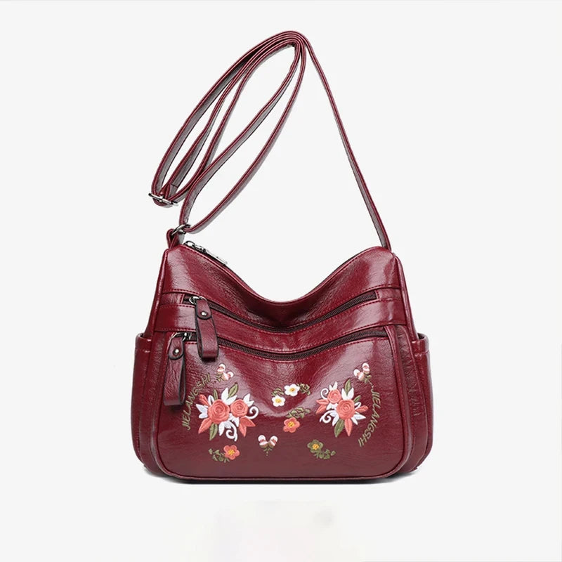 Casual Leather Crossbody Handbag Embroidered Flower Shoulder Bag