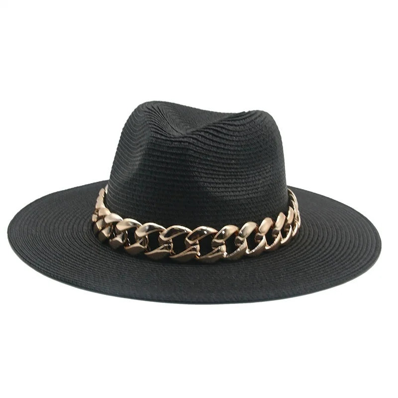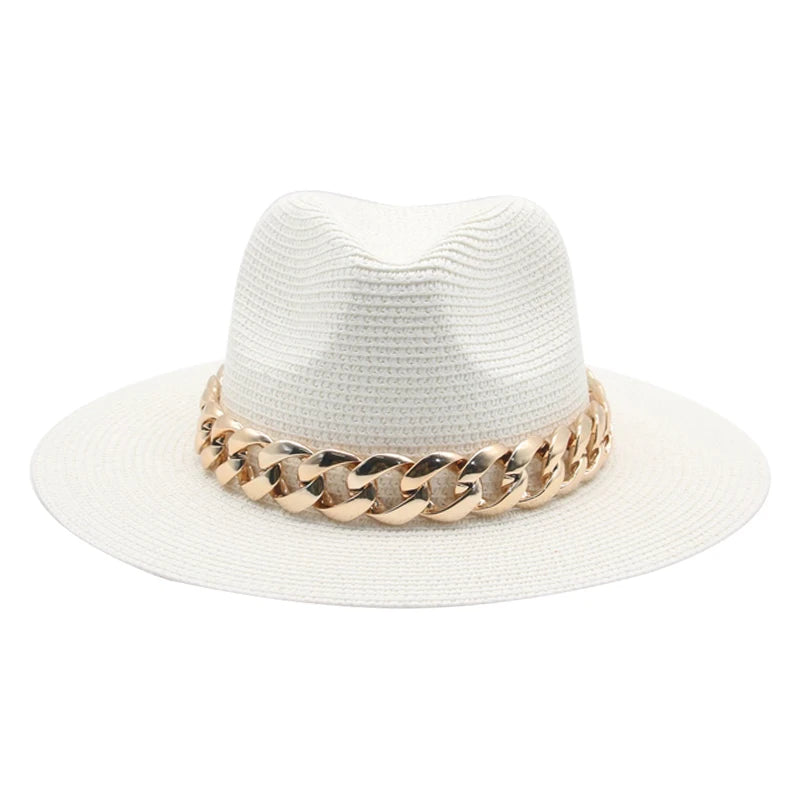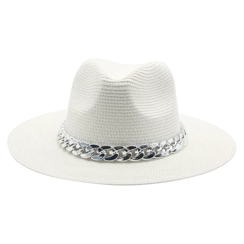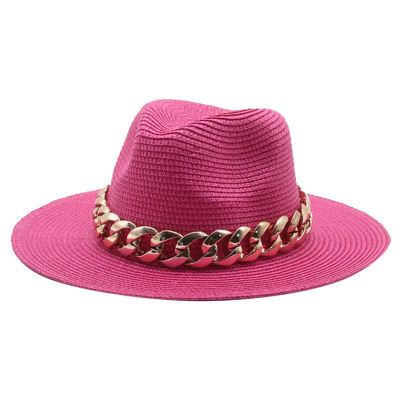 1 * Summer Fedora with Chain Belt Sun Straw Panama Outdoor Beach Hat