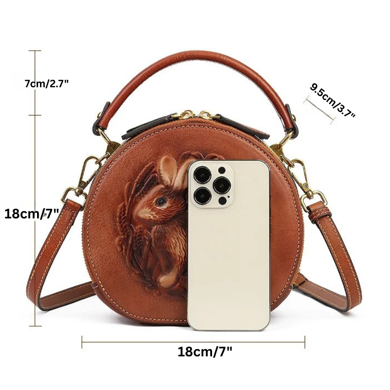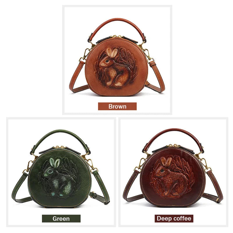 Retro Round Genuine Leather Handbag Rabbit Embossed Shoulder Bag