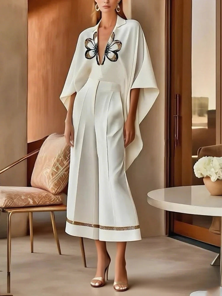 1 * V-Neck High-Low Floral Top and Wide-Leg Pants Set Elegant Outfit Suit