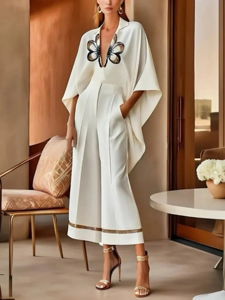 V-Neck High-Low Floral Top and Wide-Leg Pants Set Elegant Outfit Suit