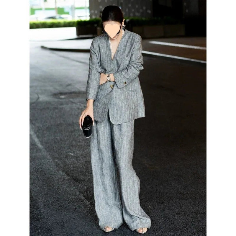 Cotton Linen Striped Blazer and Wide Leg Pants Retro Streetwear Set
