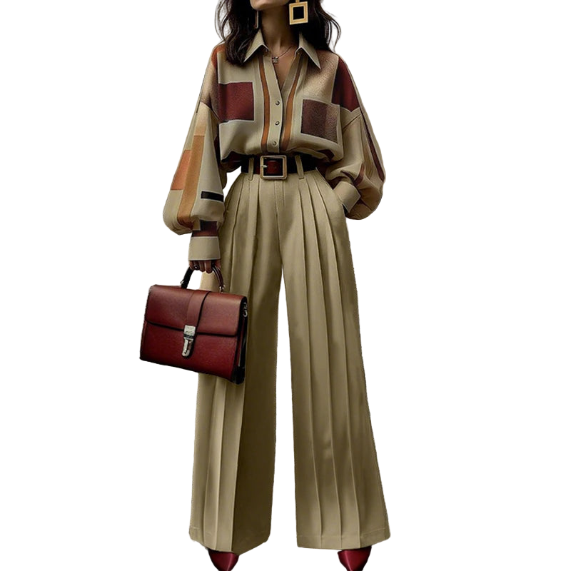 📌Two-piece vintage-inspired outfit: Lantern-sleeve shirt + wide-leg pants