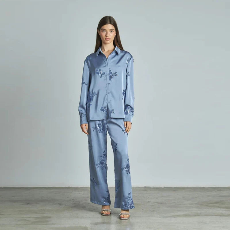 Embroidered Beaded Long Sleeve Shirt Loose Tie Pants Two Piece Set