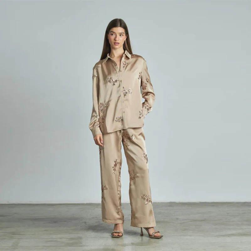Make a sophisticated statement with the Embroidered Beaded Long Sleeve Shirt Loose Tie Pants Two Piece Set  from Arimonz. Designed for the modern woman who loves a touch of elegance, this stunning set features a lapel-collared, single-breasted long sleeve shirt adorned with delicate embroidery and beadwork, paired with relaxed tie-waist straight-leg pants for a refined yet effortless look.