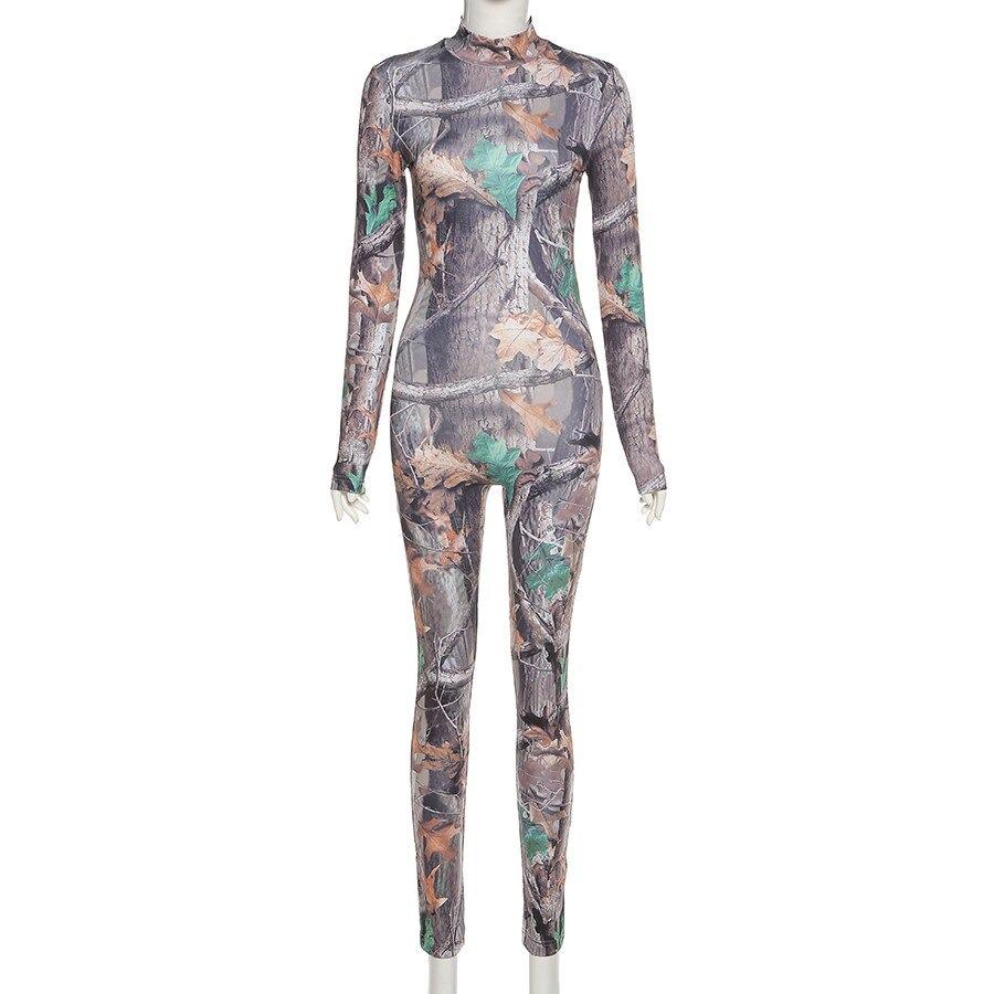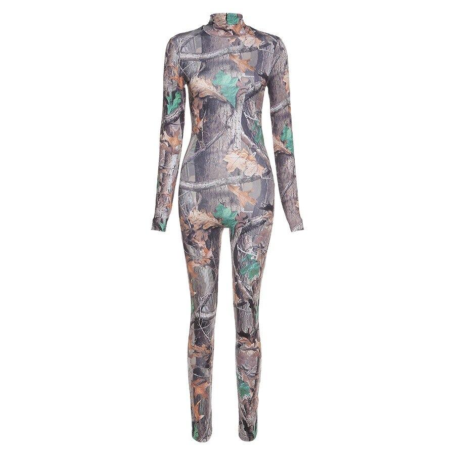 Aesthetic Print Jumpsuit Women Zip Up Skinny Elastic Turtleneck