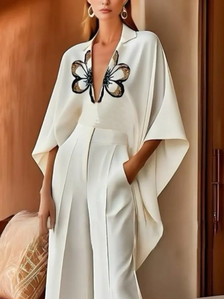 1 * V-Neck High-Low Floral Top and Wide-Leg Pants Set Elegant Outfit Suit