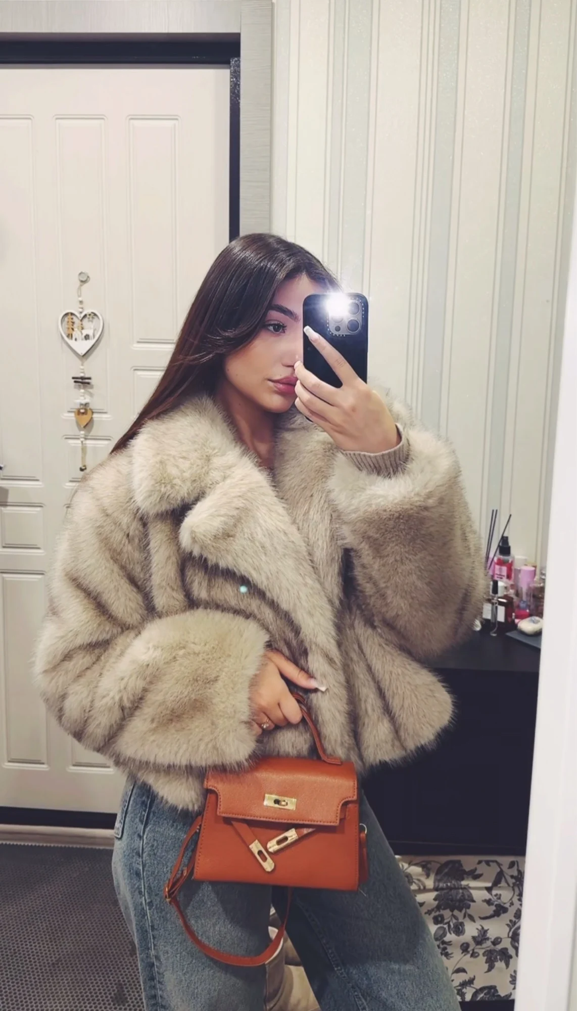 Stylish and eye-catching silhouette.Iconic Fluffy Furry Faux Fur Jacket Winter Shaggy Overcoat Fur Coat
