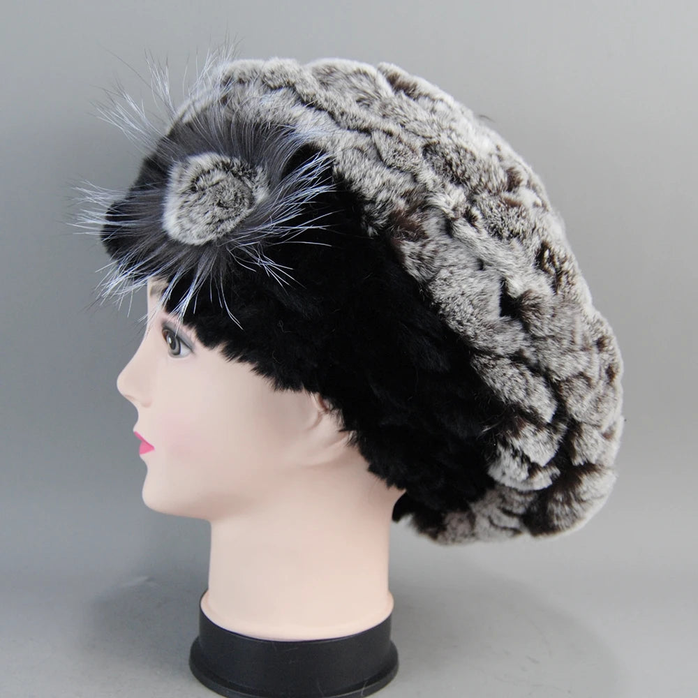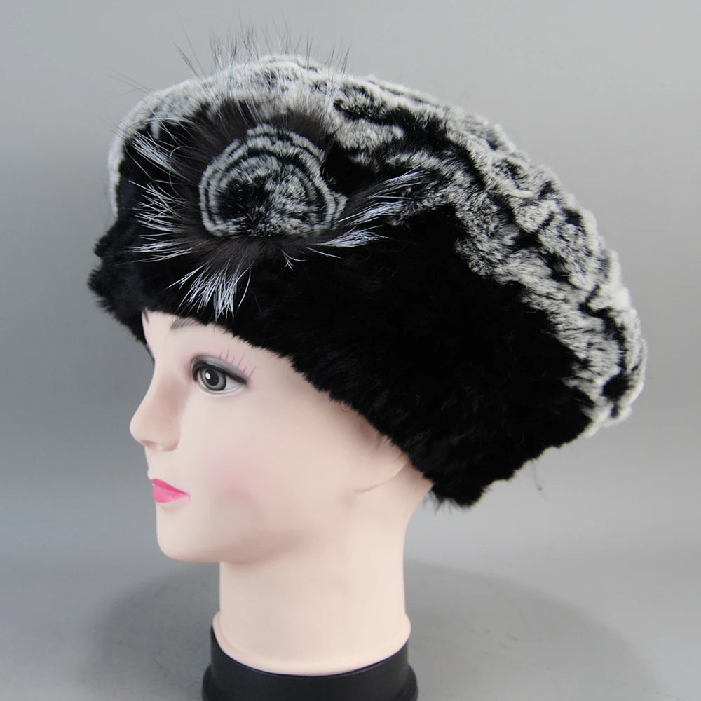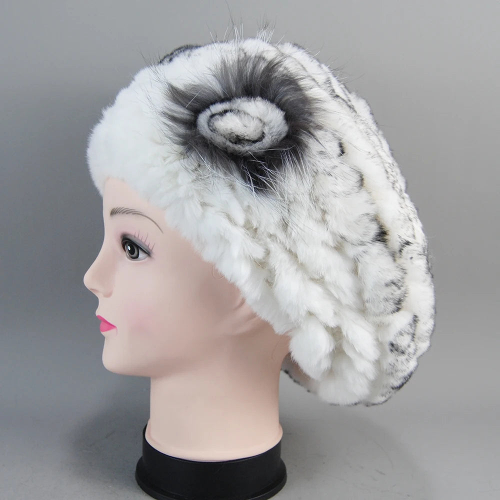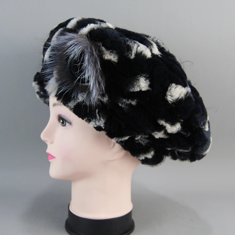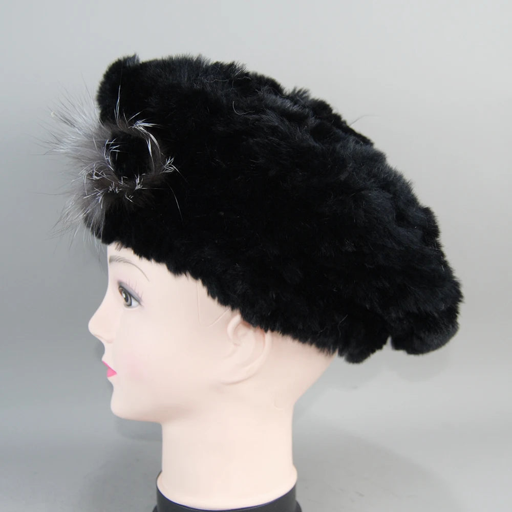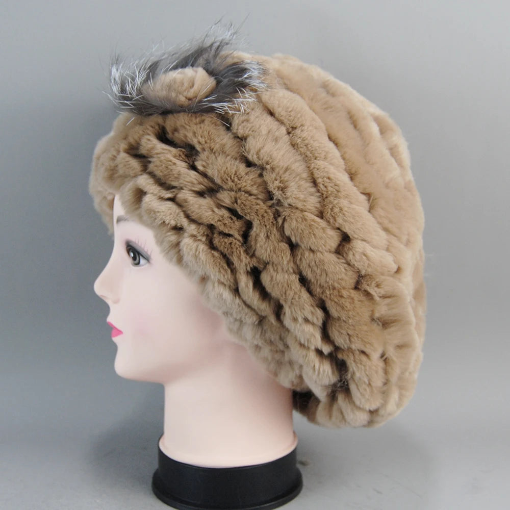 Real Rex Rabbit Fur Beanie Natural Knitted Fur Beret Warm Winter Hat