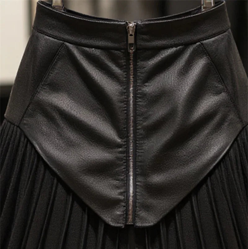 Make a statement with this Leather Tulle Midi Skirt Asymmetric Zip Front High Waist A-Line Skirt from Arimonz, a striking blend of edgy structure and soft femininity. Designed with a high waist A-line silhouette, this skirt features an asymmetric front zipper and a pleated tulle hem, creating dramatic contrast and modern movement.