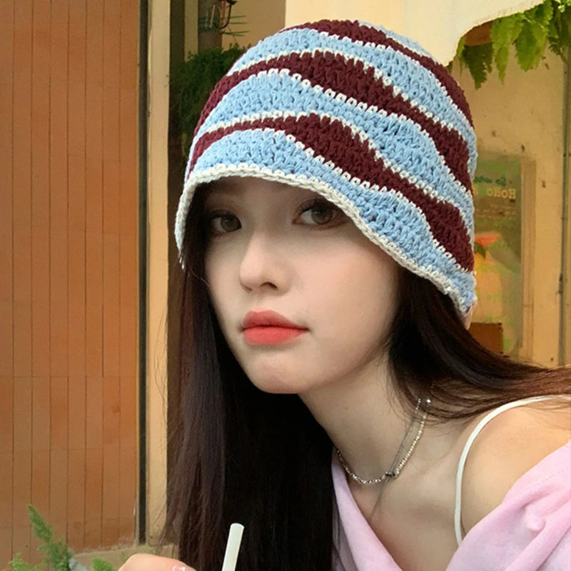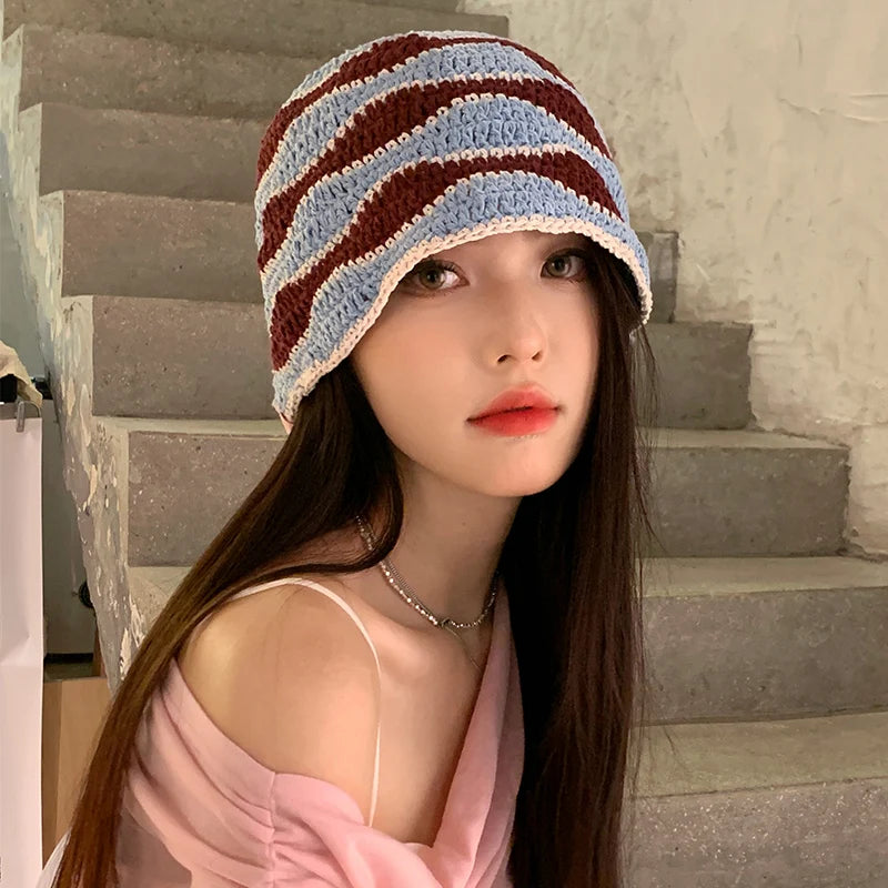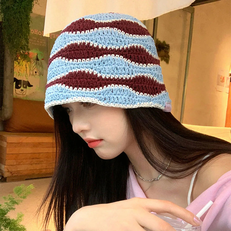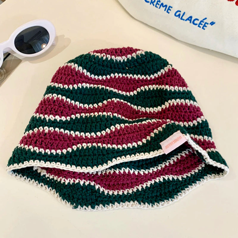 Gradient Stripe Woolen Bucket Hat Handmade Plush Knitted Fisherman Hat