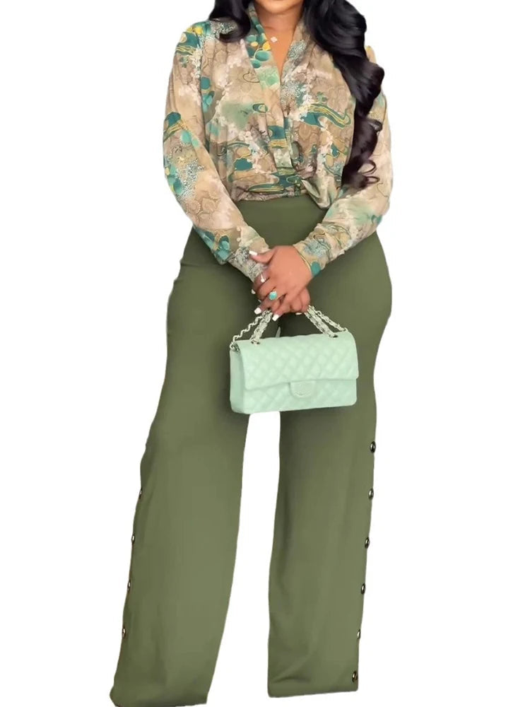 Long Sleeve Print Shirt and Wide Leg Pant Streetwear Two Piece Set