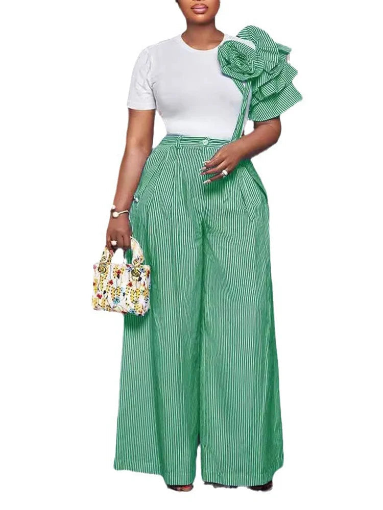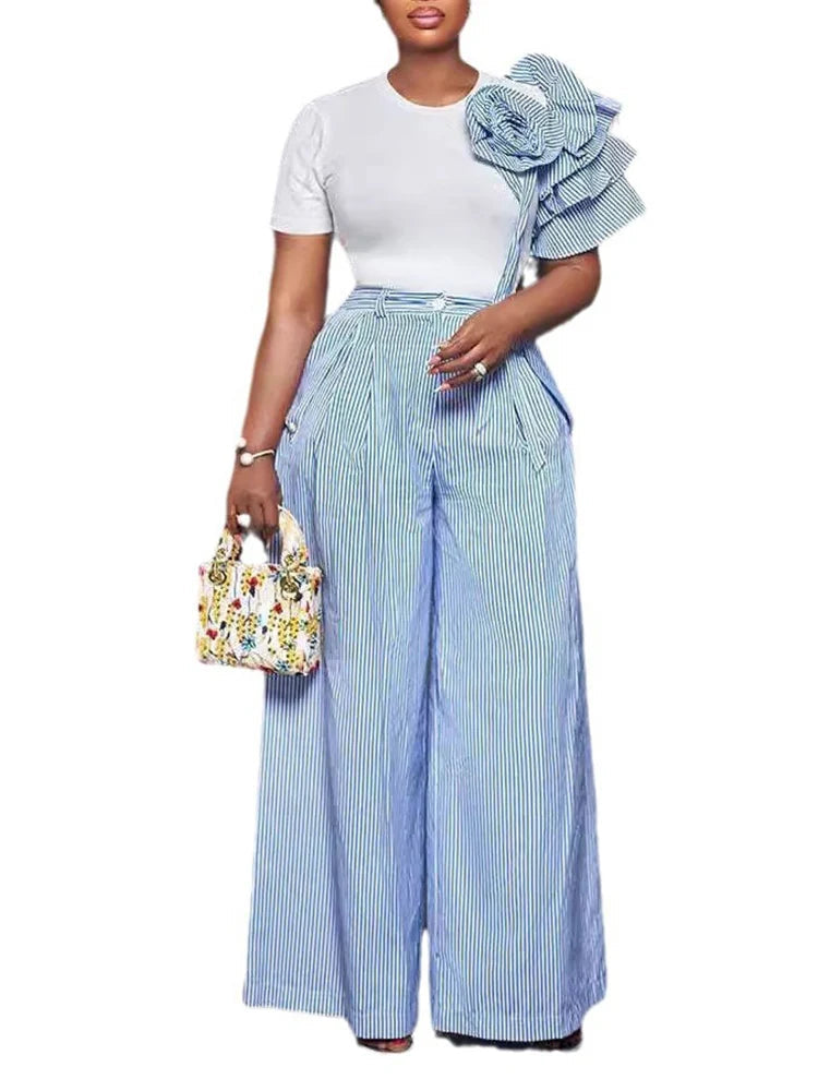 Turn everyday into a runway with the Stripe Print Flower Ruffle Sleeve Shirt Top and Wide Leg Pants 2pc Set from Arimonz. This standout streetwear-inspired outfit features a chic striped top adorned with delicate 3D flower embellishments and dramatic ruffle sleeves, paired perfectly with flowy wide-leg pants for a look that’s equal parts edgy and elegant.
