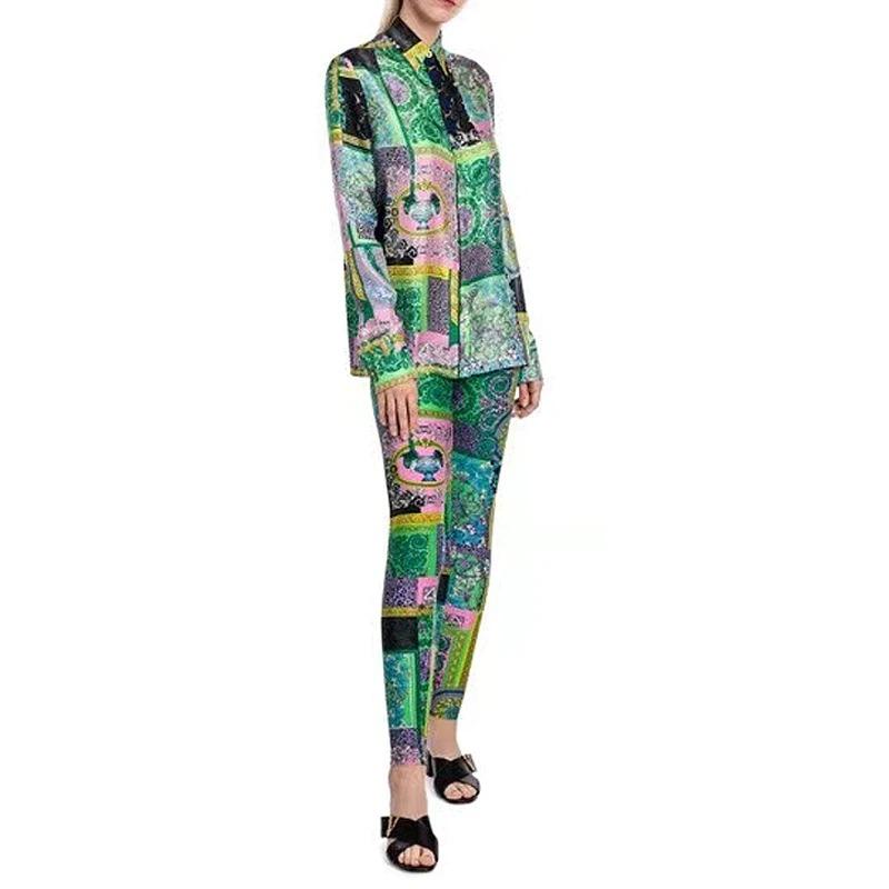 Casual Slim-fit Shirt Printed Leggings Pants Suit Women 2 Piece Set